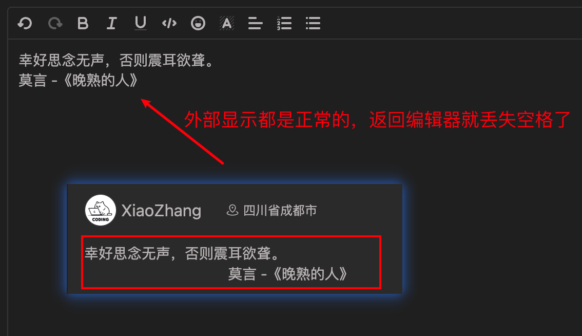最近在使用quill.js 封装 quill editor 时,遇到了一个奇怪的问题,明明在保存的时候保存的是携带空格的值,返回的数据也是正常携带空格的,重新赋值到 editor 中,空格/Tab丢失了